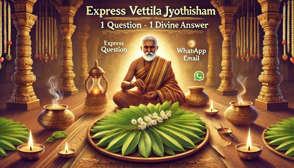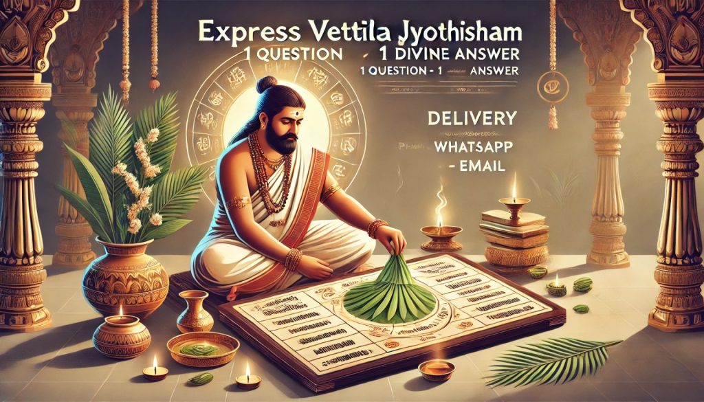 Step into the sacred world of Vettila Jyothisham, where Kerala Priest K. Namboothiri and his expert temple astrology team use the traditional betel leaf (vettila) ritual to unveil divine guidance. This powerful consultation answers 5 important questions across key areas of your life — including marriage and relationships, health and well-being, career and business, property or land concerns, and spiritual blockages or doshas. Rooted in Kerala’s ancient temple traditions, this ritual offers deep clarity and remedies for your life’s most pressing matters.